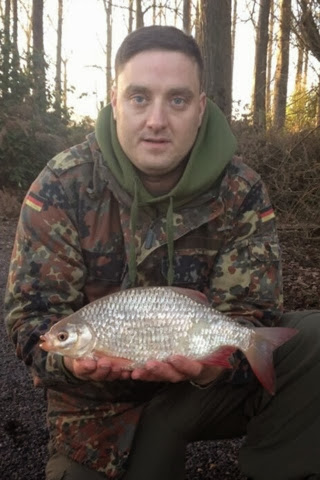 bobbled and slid under with smooth professional strike I connected with a solid resistance a healthy bend in the rod. I started to panic and called out to Dave saying I'm in, while walking towards me he said do you want a hand landing it I said no I'm ok and with the professional skill of Jan Porter or Bob Nudd I duly slip the net under the biggest Roach/Rudd hybrid we have both seen and at a weight of a monstrous 1lb 14oz it's a new PB it just goes to show you that beauty comes in all shapes and sizes.